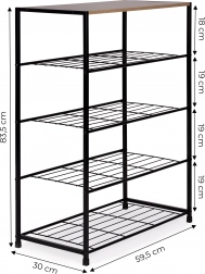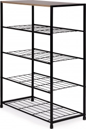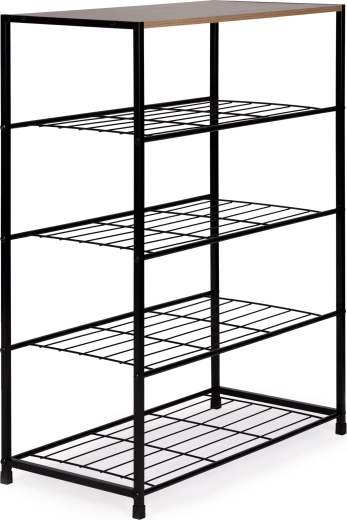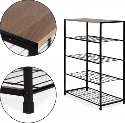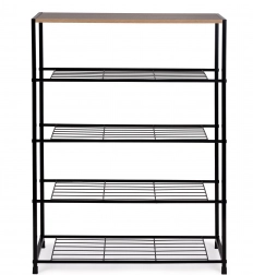 Štýlový botník v loftovom štýle kombinuje stabilný čierny kovový rám a priestrannú drevenú hornú dosku na dekorácie či kľúče. Päť úrovní kovových roštových políc pojme až 12–16 párov obuvi, ideálny do predsiene, obývačky, šatne aj kancelárie. Kompaktné rozmery, vysoká nosnosť a jednoduchá údržba z neho robia univerzálne riešenie na každodennú organizáciu.