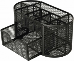 Praktický stolový organizér z odolnej kovovej sieťoviny vám pomôže mať všetko po ruke a na svojom mieste. Deväť šikovne rozdelených priehradok pojme ceruzky, nožnice, pravítka, sponky aj lepiace bločky, zatiaľ čo výsuvná zásuvka je ideálna na drobnosti a poznámkové lístky. Vďaka otvorenej konštrukcii máte nad obsahom vždy perfektný prehľad.