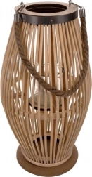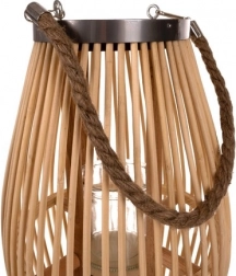 Interiérové držanie sviečky zabezpečuje sklenený držiak, ktorý chráni plameň a umožňuje svetlu rozptýliť sa cez bambusové lamely.