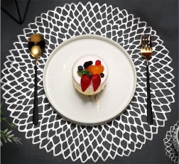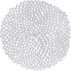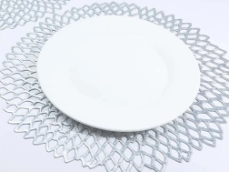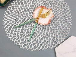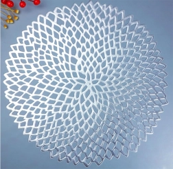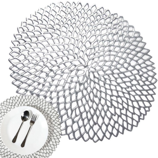 Elegantné okrúhle prestieranie z odolného plastu s ažúrovým vzorom v striebornej farbe dodá vášmu stolu štýl a zároveň ho ochráni. Priemer 41 cm, protišmyková úprava, vodeodolné a ľahko sa čistí – ideálne na každodenné aj slávnostné stolovanie.