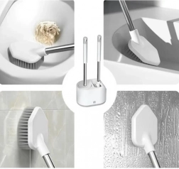 Okrúhla TPR hlavica je pružná a šetrná ku keramike, plochá trojuholníková hlavica z PP s ostrou špičkou vyčistí aj ťažko dostupné rohy a okraje pod lemom misy.