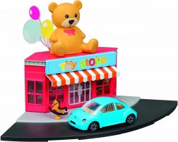 - Plastová budova hračkárstva, kovový model auta 1:43, pouličné a chodníkové prvky, doplnky