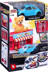 Postavte si vlastné mesto s hernou sadou Bburago City Hračkárstvo 1:43. Kovový model auta v mierke 1:43, plastová budova s pohyblivými dverami, pouličné a chodníkové prvky a rôzne doplnky pre kreatívne hranie. Sadu možno kombinovať s ďalšími setmi série StreetFire.