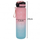 Štýlová motivačná fľaša na vodu s objemom 1 l v ružovo‑modrom prechode vám pomôže dodržiavať pitný režim vďaka časovým značkám, objemovej stupnici a motivačným nápisom. Má flip veko s poistkou, mäkký silikónový náustok s vyberateľnou slamkou pre pohodlné pitie bez nakláňania, je tesná vďaka silikónovému tesneniu a ponúka ľahký a odolný materiál PP s matným povrchom a pútko na nosenie.