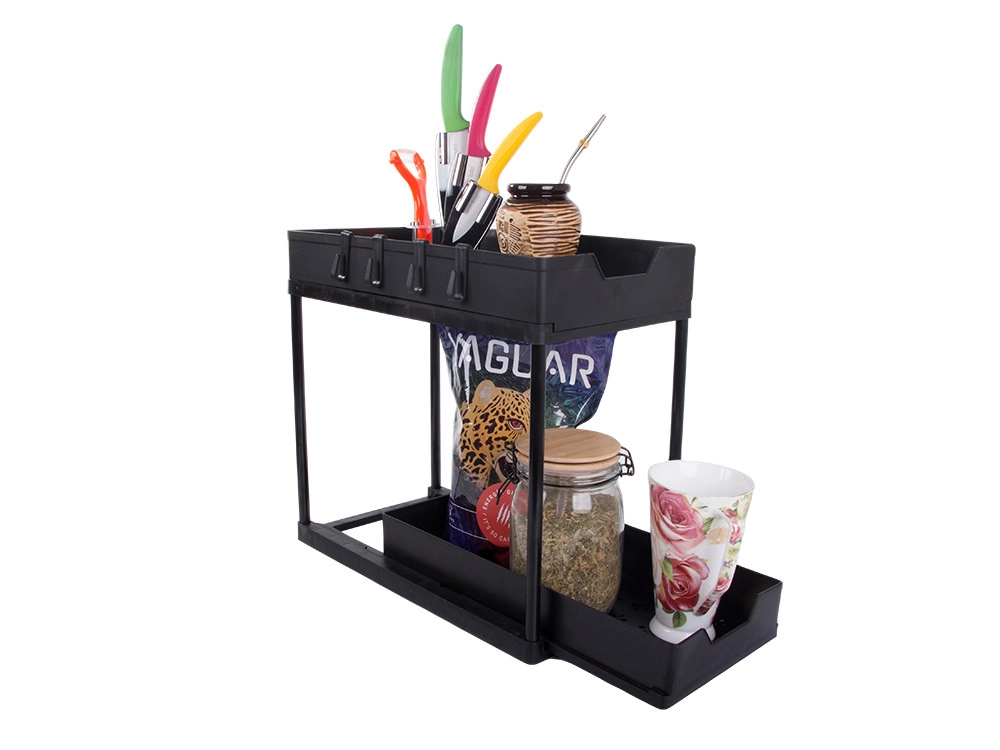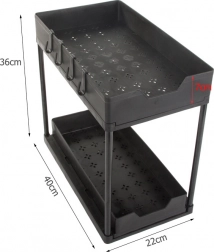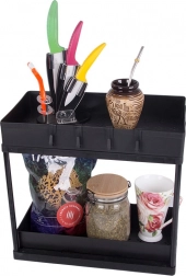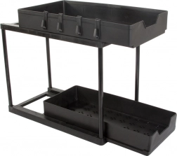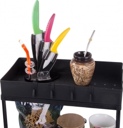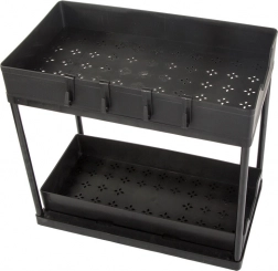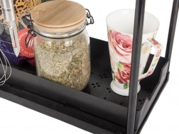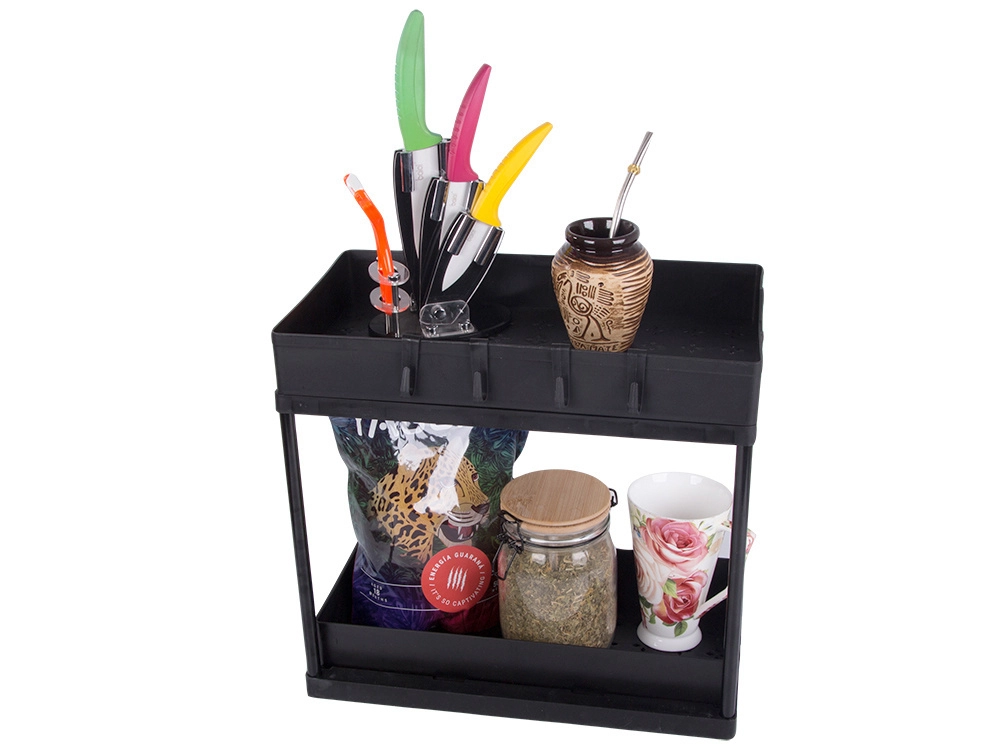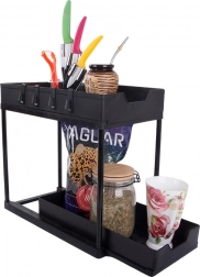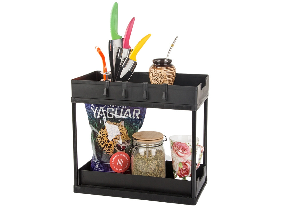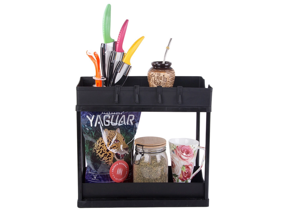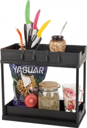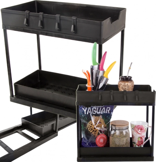 Tento viacúčelový stojan na koreniny ponúka šikovné dvojposchodové usporiadanie s výsuvom, ktoré zabezpečí prehľad a rýchly prístup k uloženým veciam. Štyri praktické háčiky vpredu sa hodia na metličky, lyžičky či utierky. Minimalistický dizajn v čiernej farbe skvelo zapadne do moderných aj tradičných interiérov.