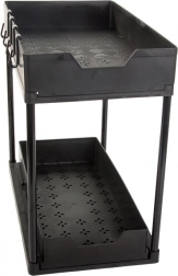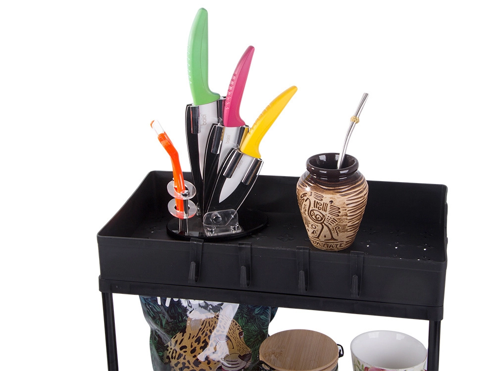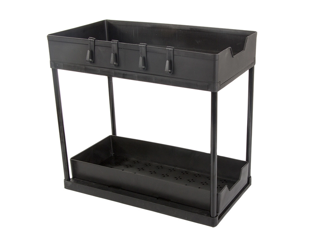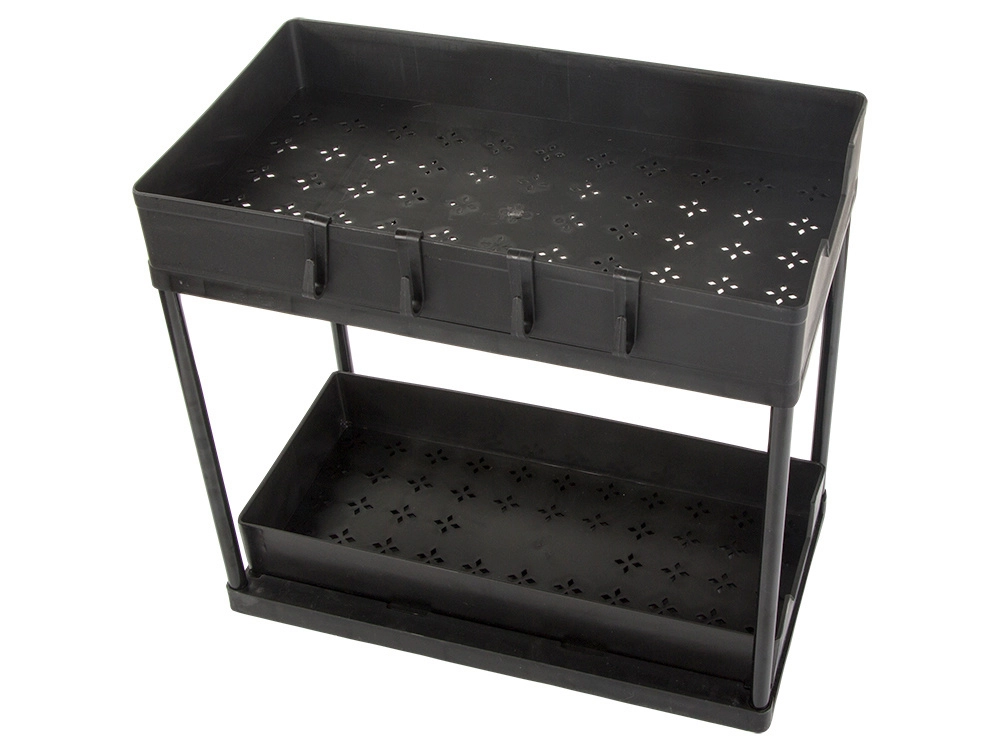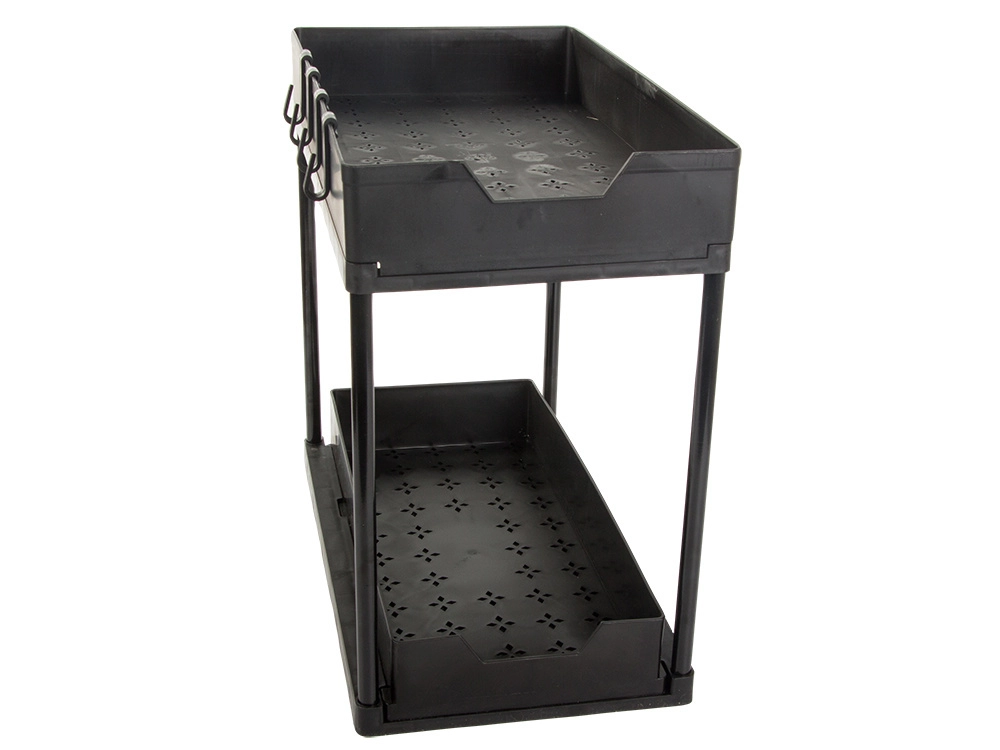 Tento viacúčelový stojan na koreniny ponúka šikovné dvojposchodové usporiadanie s výsuvom, ktoré zabezpečí prehľad a rýchly prístup k uloženým veciam. Štyri praktické háčiky vpredu sa hodia na metličky, lyžičky či utierky. Minimalistický dizajn v čiernej farbe skvelo zapadne do moderných aj tradičných interiérov.