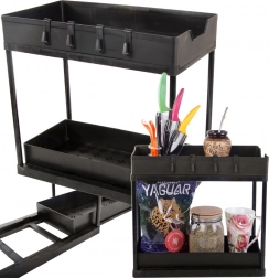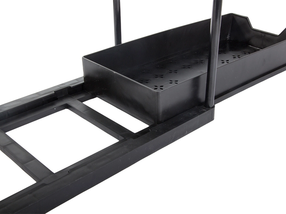 Výsuvný mechanizmus oboch poschodí umožňuje pohodlne dosiahnuť na každú nádobku či doplnok bez toho, aby ste museli prekladať celý stojan.