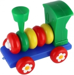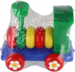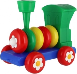 Vláčik je vyrobený z plastu vo výrazných farbách, ktoré priťahujú pozornosť detí, a zdobený kvetinovými motívmi na kolesách.