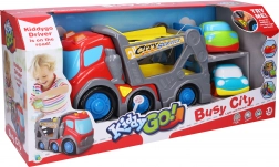 Zábavná sada pre malých vodičov: odťahové vozidlo Kiddy s dĺžkou 31 cm a dve osobné autíčka 9 cm. Ponúka svetelné a zvukové efekty, voľné kolesá pre plynulú jazdu a sklápaciu rampu s dvoma plošinami pre jednoduché nakladanie. Vhodné pre deti od 18 mesiacov, batérie 2× AA sú súčasťou balenia.
