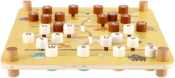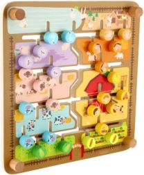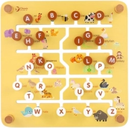Šikovná a zábavná pomôcka pre predškolákov: obojstranná doska ukrýva dva svety. Na farme deti posúvajú kolíky so zvieratkami, tvárami a ovocím po vyfrézovaných dráhach na ich miesto. Otočením dosky sa zmení na abecedný labyrint – úlohou je doviesť kolík s počiatočným písmenom k správnemu zvieratku (názvy sú v angličtine), takže sa hravo precvičia písmená aj slovná zásoba.