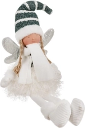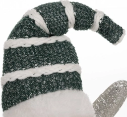 Pletená čiapka, šál a čižmičky v bielej a tmavozelenej farbe dodávajú figúrke útulný vzhľad a dokonale podčiarknu zimnú a vianočnú atmosféru domova.