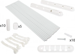 Balenie obsahuje: 15 oceľových tyčí, 5 povrazov, 10 skrutiek, 10 hmoždiniek, 5 zaisťovacích guličiek, 10 tyčových spojov, 2 držiaky šnúr, 1 držiak guličiek, originálne balenie.