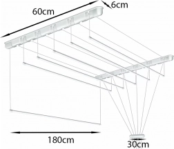 Sušiak sa montuje na strop, takže nezaberá podlahu. Rozmery 180 × 60 × 30 cm poskytujú veľkú sušiacu plochu aj v malej kúpeľni či na balkóne.
