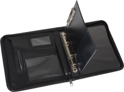 Elegantná diplomatka vo formáte A5 v matnej čiernej farbe je ideálna na každodennú organizáciu dokumentov. Ponúka zapínanie na zips, vnútorné vrecká na dokumenty a vizitky, držiak na písacie potreby a 4‑krúžkovú mechaniku D20 na prehľadné zakladanie.