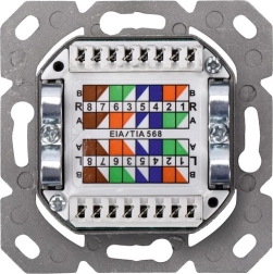 Zásuvka disponuje dvoma portami RJ45 typu 8P8C, čo vám umožní ľahké a flexibilné pripojenie k sieťovým zariadeniam. Farebne kódované spoje LSA+ podľa štandardu EIA/TIA 568B zlepšujú orientáciu pri inštalácii kabeláže.