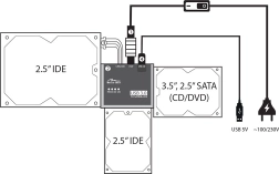 Súčasné pripojenie jedného SATA a jedného IDE zariadenia urýchli presun dát bez kopírovania na interný disk počítača. Externý napájač s vypínačom zabezpečuje bezpečné používanie aj s väčšími 3,5" diskami.