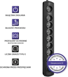 Ochrana je na prvom mieste: vstavaná prepäťová ochrana (varistor) chráni zariadenia pred napäťovými špičkami, detské poistky v každej zásuvke zabraňujú náhodnému kontaktu a nehorľavý PP materiál zvyšuje bezpečnosť pri každodennom používaní v domácnosti, kancelárii aj dielni.