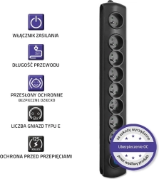Bezpečnosť je na prvom mieste: integrovaný varistor chráni pred náhlymi špičkami napätia, detské clony sťažujú nechcený kontakt a nehorľavý materiál PP zvyšuje odolnosť pri každodennom používaní. Premyslený dizajn v čiernej farbe skvele zapadne do moderného interiéru, umožní navinutie prebytočného kábla okolo tela lišty a ponúka aj možnosť montáže na nábytok.