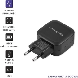 Nabíjačka s výkonom 3.4A umožňuje nabíjanie až troch zariadení naraz od smartfónov, tabletov po GPS navigácie a ďalšie kompatibilné prístroje. Každý port USB podporuje rôzne typy káblov. Vyrobená z kvalitných materiálov, zaisťuje bezpečné a efektívne nabíjanie. Je ľahká, ale pevná s moderným dizajnom a nízkou energetickou spotrebou.
