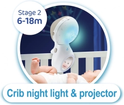 Ľahko sa pripevní na postieľku a vďaka trom režimom používania rastie s dieťaťom: od kolotoča (0–5 mesiacov), cez lampičku na postieľku (6–18 mesiacov) až po samostatný nočný projektor na stolík (od 18 mesiacov).