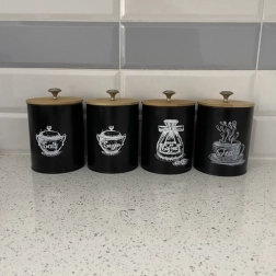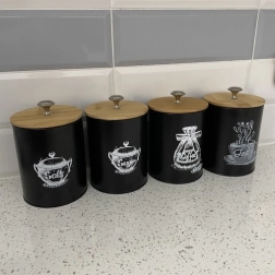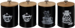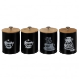Set obsahuje štyri dózy označené pre 'Soľ', 'Cukor', 'Čaj' a 'Kávu', čo pomáha udržať ich obsah organizovaný a ľahko dostupný. Vďaka kovovému úchytu na viečku je otváranie a zatváranie dóz jednoduché a pohodlné.