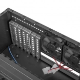 - Ventilačné otvory, pozície pre ventilátory; zadná časť s osadenými ventilátormi (podľa konfigurácie)