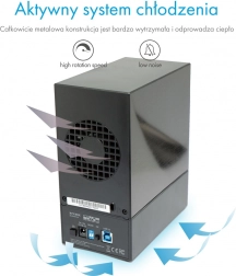 Jednoduchá výmena diskov bez zložitej demontáže a 60 mm ventilátor pre stabilné teploty a dlhšiu životnosť HDD.