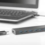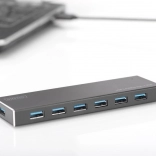 Obchodný hub DIGITUS USB 3.0 je ideálnym doplnkom každého pracoviska. Umožňuje pripojiť a používať až sedem USB zariadení súčasne, čo znamená, že používanie niekoľkých vstupných zariadení alebo prenosných úložísk nebude žiadny problém. Vďaka technológii USB 3.0 prenáša dáta rýchlosťou až 5 Gbps, čo zaručuje rýchlu výmenu dát.