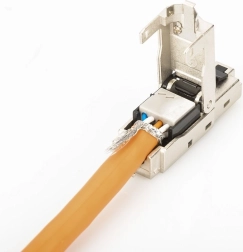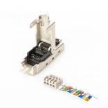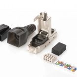 Modulárny konektor RJ45 DIGITUS je ideálny pre rýchlu a efektívnu montáž bez potreby špeciálnych nástrojov. Tento konektor zabezpečuje bezpečné pripojenie vďaka svojmu 360° tieneniu, ktoré chráni pred elektromagnetickými interferenciami.