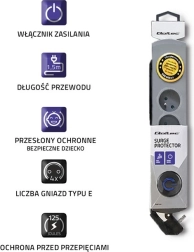 Dôraz na bezpečnosť zabezpečujú prepäťové ochrany s varistorom, ktoré chránia elektroniku pri náhlych špičkách napätia, detské poistky vo všetkých zásuvkách a nehorľavý materiál PP. Praktické riešenie s možnosťou uchytenia na nábytok a vedenia či omotania prebytočného kábla pomáha udržať poriadok a voľný priestor.