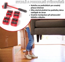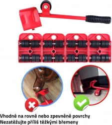 Praktická súprava na jednoduché presúvanie ťažkých kusov nábytku a spotrebičov až do 150 kg. Obsahuje páku na nadvihnutie nábytku a štyri transportné rolky s protišmykovou podložkou a otáčaním o 360°, vďaka ktorým presuniete práčku, chladničku či komodu rýchlo, bezpečne a bez námahy.