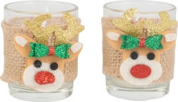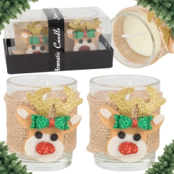 Táto sada dvoch vonných sviečok prináša kúzlo Vianoc do vášho domova. Sklenená nádoba je ozdobená sobom so zlatými rohmi, zelenou mašľou a červeným lesklým nosom. Vhodné ako darček pre rodinu a priateľov, ktorý navodí teplú a príjemnú atmosféru.