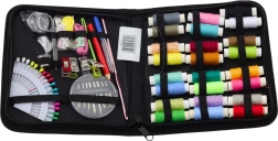 - Obsah sady: 24 farebných nití a cievok, biele gombíky, farebné špendlíky s hlavičkami, klipsy, ihly v okrúhlom puzdre, navliekač, kovový náprstok, párač, nožnice, háčik, plastová pinzeta, krajčírsky meter a krajčírska ceruzka.