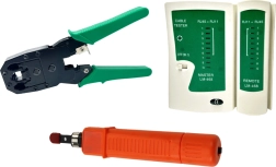 Krimpovacie kliešte 4/6/8P, káblový tester s LED a úderový LSA nástroj pokryjú celý proces od prípravy kábla po kontrolu spojov.