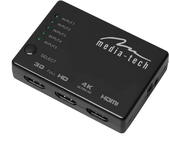 Kompaktný 5-portový HDMI prepínač od MEDIA-TECH vám umožní pripojiť až päť zariadení k jednej TV či monitoru a jednoducho medzi nimi prepínať. Podporuje 4K Ultra HD, Full HD, 3D video aj 12-bitovú farebnú hĺbku a zvláda pokročilé audio formáty ako DTS‑HD či Dolby TrueHD. Inštalácia je Plug & Play bez ovládačov, prepínať možno tlačidlom na tele alebo diaľkovým ovládačom.