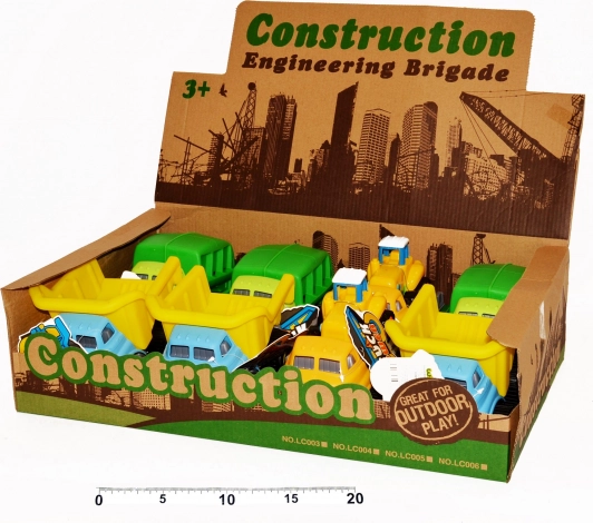 Stavebné auto 16 cm s voľnými kolesami v 3 variantoch: sklápač, odťahovka, smetiari. Praktické balenie v display boxe po 8 kusoch. Skvelé na detskú hru.