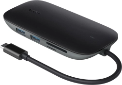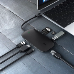 Rozbočovač Aukey CB-C71 USB-C je v skutočnosti rozbočovač 8 v 1. Stačí ho pripojiť k jednému portu USB a získate až OSEM vstupov, ktoré sú nevyhnutné na každodennú prácu. Je vybavený tromi portmi USB 3.0, USB‑C Power Delivery, portom HDMI, portom Ethernet a tiež dvoma slotmi na karty. Už vám nebudú chýbať voľné USB porty – odteraz budete môcť pripojiť všetky zariadenia, ktoré potrebujete, a ešte viac.
