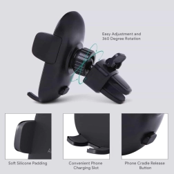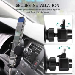 Široko nastaviteľná čeľusť s tlačidlom rýchleho uvoľnenia umožňuje bleskové vloženie aj vybratie telefónu. Kontaktné plochy sú vystlané mäkkým silikónom, ktorý tlmí otrasy, drží telefón bez kĺzania a chráni ho pred škrabancami. Upevňovací mechanizmus je kompatibilný s väčšinou štandardných ventilácií – poradí si s horizontálnymi aj vertikálnymi lamelami a s tenšími aj hrubšími mriežkami.