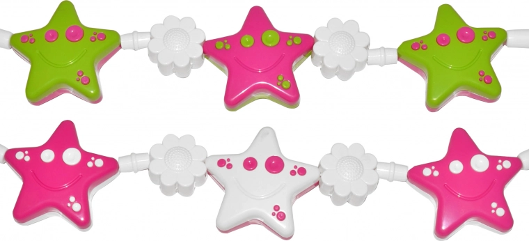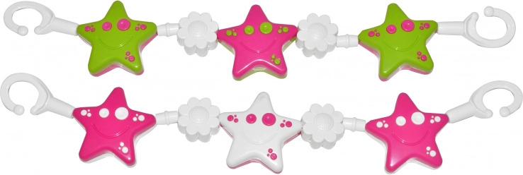 Farebná reťaz na kočík s hviezdami a kvetinkami pre motorický rozvoj dieťaťa. Pestré farby a jednoduché upevnenie.