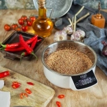 Váha je vybavená prehľadným digitálnym displejom, funkciou tara na vynulovanie hmotnosti nádoby a možnosťou automatického alebo ručného vypnutia na úsporu batérie. Praktickým bonusom je režim na meranie objemu vody a mlieka, keď práve nemáte po ruke odmerku.