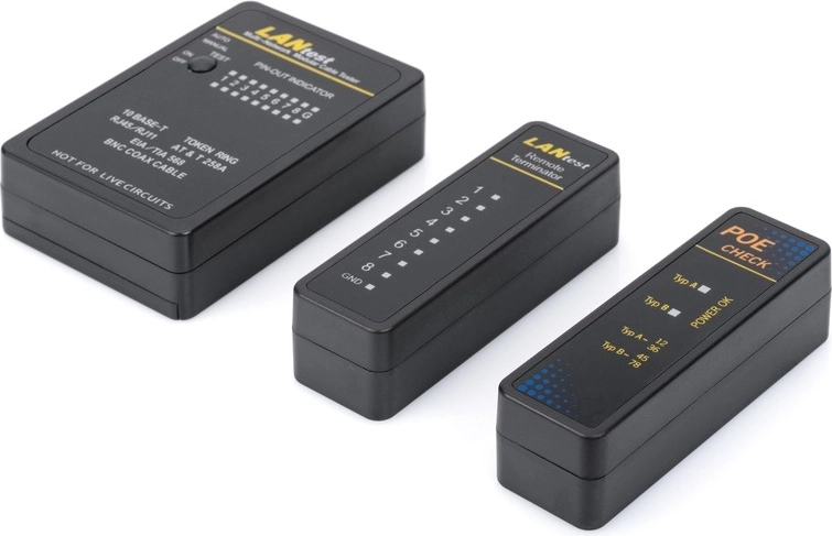 Vstavaná funkcia PoE Check okamžite ukáže, či je na porte k dispozícii napájanie podľa IEEE 802.3af/at a aký je jeho režim. Tester je vhodný pre krútené páry (UTP/FTP/STP), telefónne linky RJ11/RJ12 aj koaxiálnu kabeláž BNC – ideálny pomocník pri inštalácii DSL prípojok aj údržbe LAN.