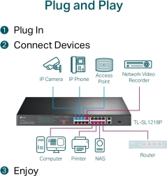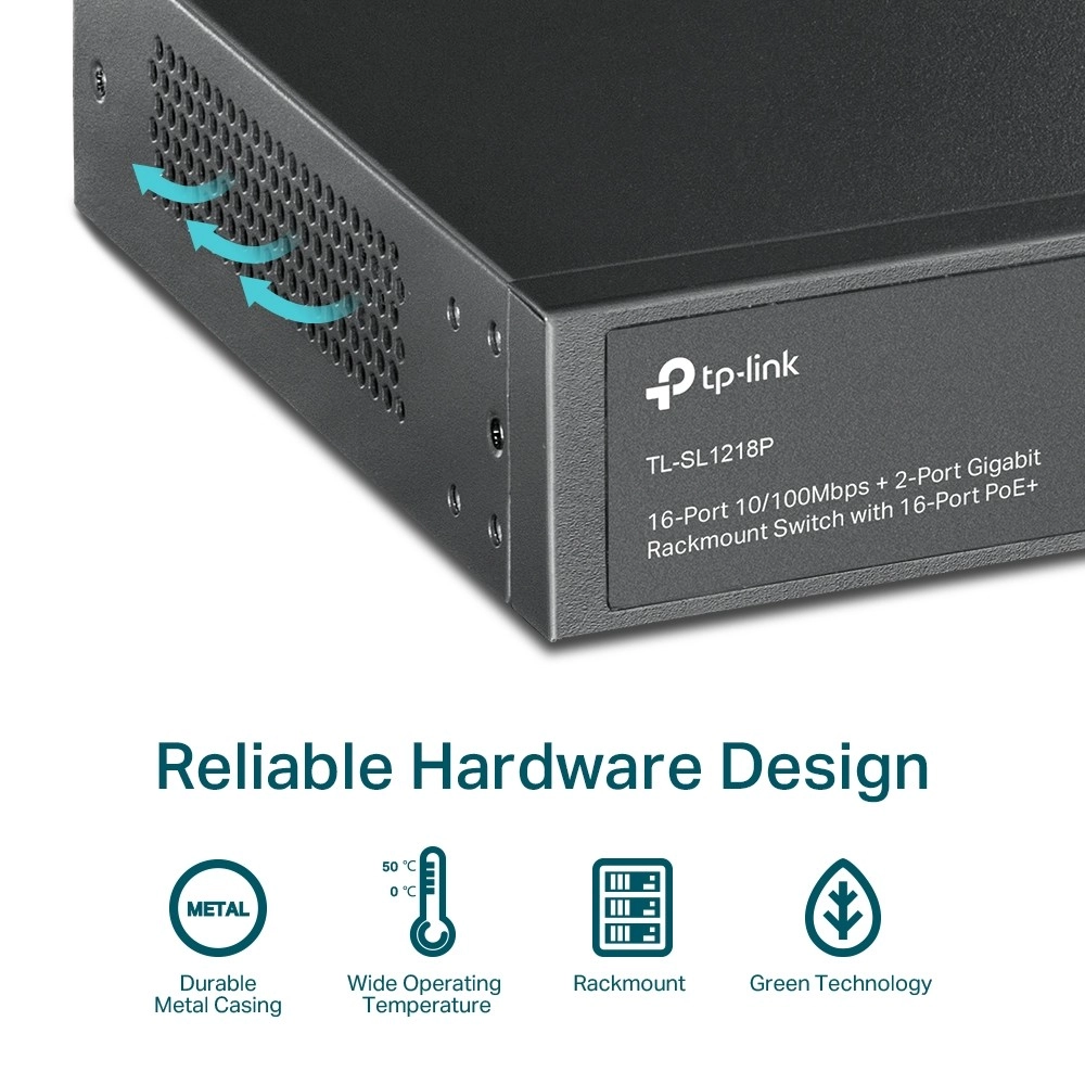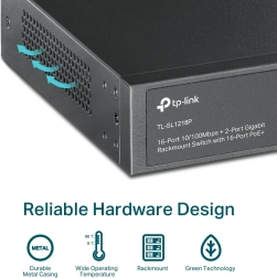 TP-Link TL-SL1218P je spoľahlivý rackmount switch pre IP kamery, prístupové body a VoIP telefóny. Poskytuje 16 portov 10/100 Mb/s s PoE+ podľa 802.3af/at, dva gigabitové uplink porty RJ45 a jeden combo gigabitový SFP pre flexibilné pripojenie k chrbticovej sieti. Napájací rozpočet 150 W umožňuje bezproblémovo napájať viac zariadení naraz.