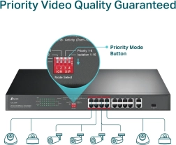 Rackový PoE+ switch na rozšírenie podnikovej aj domácej siete: 16× 10/100 Mb/s PoE+, 2× gigabitový RJ45 a 1× combo gigabitový SFP. Ponúka PoE budget 150 W (až 30 W na port), režim Extend do 250 m, Priority pre kľúčové zariadenia a Isolation pre zvýšenú bezpečnosť – všetko s plug and play inštaláciou bez konfigurácie.