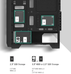 Táto moderná PC skriňa kombinuje čistý dizajn s premyslenou funkcionalitou. Bočnica zo 4 mm tvrdeného skla poskytuje panoramatický pohľad na komponenty, pričom ľahký prístup zabezpečujú ručné skrutky. Vďaka priestrannému interiéru pohodlne osadíte výkonné grafické karty a vysoké chladiče procesora.