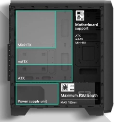 - Kompatibilita základných dosiek: ATX, Micro‑ATX, Mini‑ITX