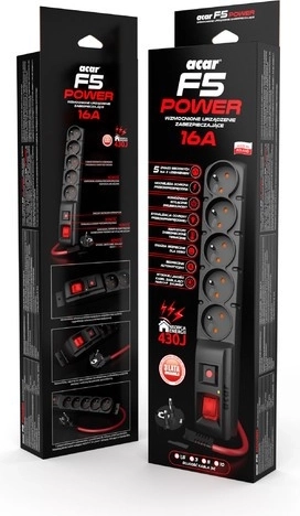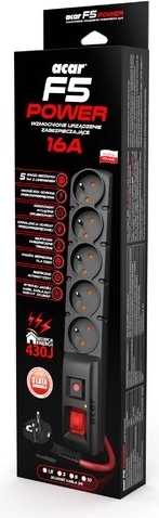 Napájacia lišta Acar F5 POWER je ideálnym riešením pre kancelárske aj domáce použitie. Vďaka svojej kompaktnej dĺžke 33 cm a piatim zásuvkám s uzemnením poskytuje dostatočné možnosti pripojenia pre väčšinu elektrických zariadení. Zosilnený vypínač je odolný voči nárazovým prúdom, ktoré bežne vznikajú pri zapínaní napájacích zdrojov stolných počítačov aj laptopov. Súčasťou je aj ukazovateľ správneho fungovania ochranného systému proti prepätiu, ktorý zabezpečuje všetky napájacie línie a odvádza energiu k uzemneniu prostredníctvom ochranného vodiča PE.