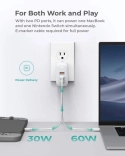 Nabíjanie troch zariadení: Dostatočný výkon na súčasné nabíjanie jedného 15,4" notebooku MacBook. Pri súčasnom použití všetkých troch portov poskytuje hlavný port USB-C až 60 W, zatiaľ čo ostatné porty poskytujú až 12 W