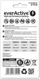 Sada lítiových batérií everActive obsahuje 4 x CR2032, 2 x CR2025 a 2 x CR2016. Ideálne pre široké použitie v rôznych zariadeniach.