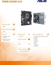 ASUS PRIME H610M-K D4 je navrhnutá pre každodennú spoľahlivosť a stabilitu. Podporuje procesory Intel Core 12. a 13. generácie na pätici LGA 1700 a využíva overené pamäte DDR4, vďaka čomu ľahko postavíte výkonný a úsporný PC pre prácu, štúdium aj multimédiá.