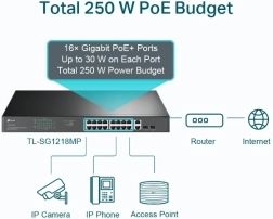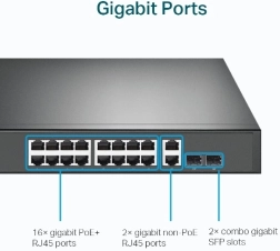 Tento switch ponúka 16 gigabitových portov s podporou PoE+, 2 gigabitové porty RJ45 a 2 gigabitové combo porty SFP pre maximálnu flexibilitu pripojenia.